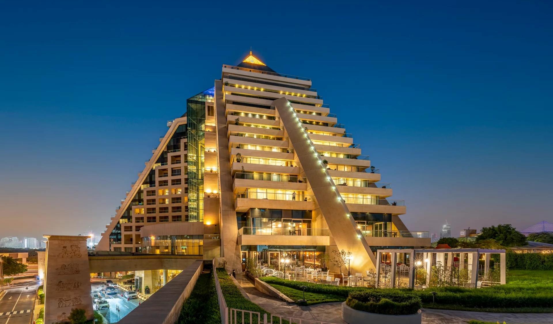 Inspired by the great pyramids of Egypt, Raffles Dubai is a stunning landmark in Dubai’s skyline. This award-winning hotel features an outdoor pool,